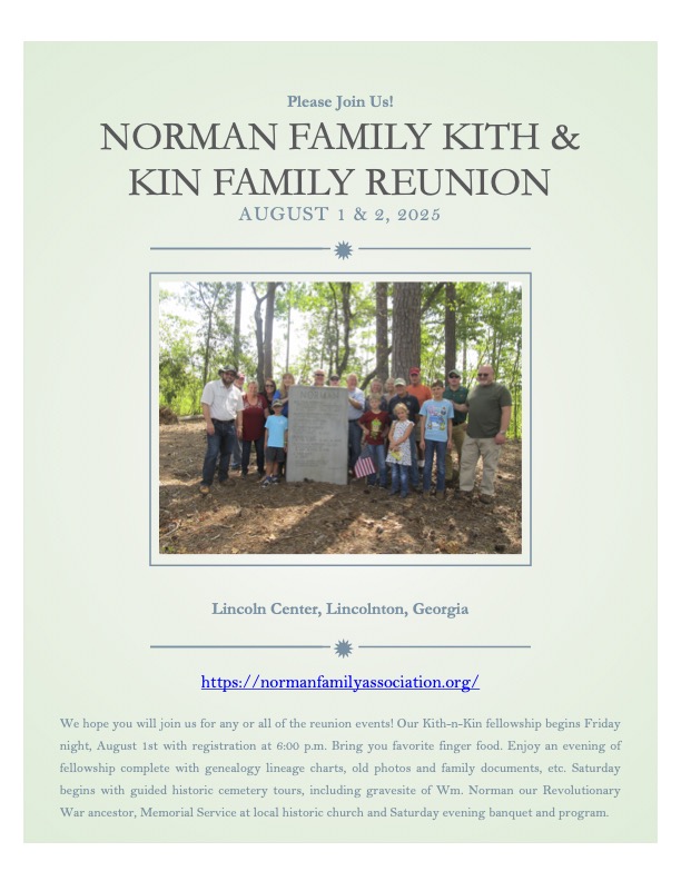 The Norman Family Association, Georgia Division is an organization of William Norman of Virginia descendants There is a Norman family reunion every two years in Lincoln County, Georgia. The next reunion is scheduled for 2023. While the Association is primarily composed of the descendants of William Norman, all branches of the Isaac Norman and Frances Courtney line are invited to attend the reunion and to join our Norman Family Association. Dues are $7.50 per year and includes the family newsletter which is issued in February, June and October. The Association fiscal year is August 1 to July 31.